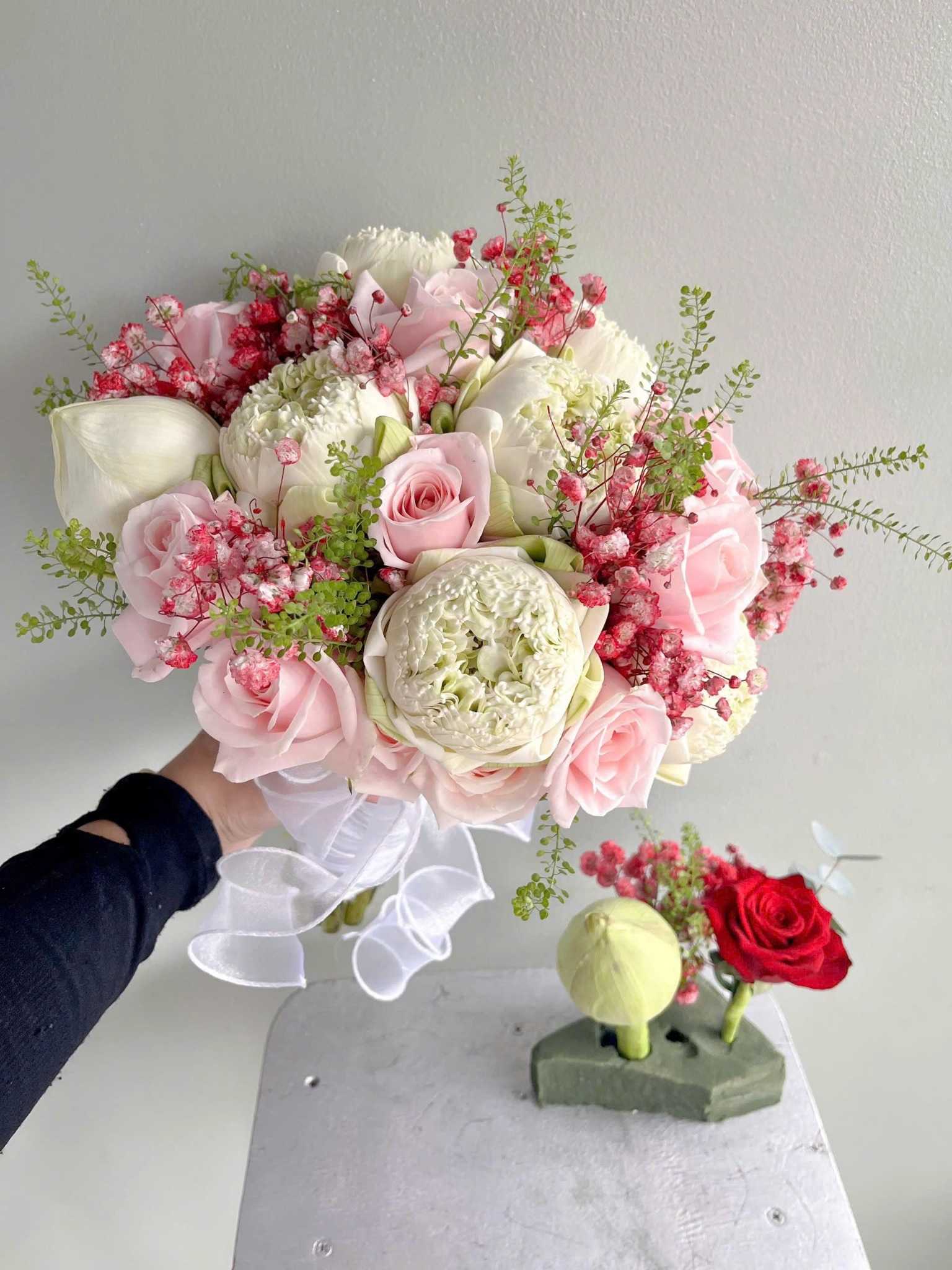 Kết hợp hồng trắng, tulip, calla lily, baby hoặc cát tường để tạo bố cục hài hòa, tự nhiên và hiện đại.