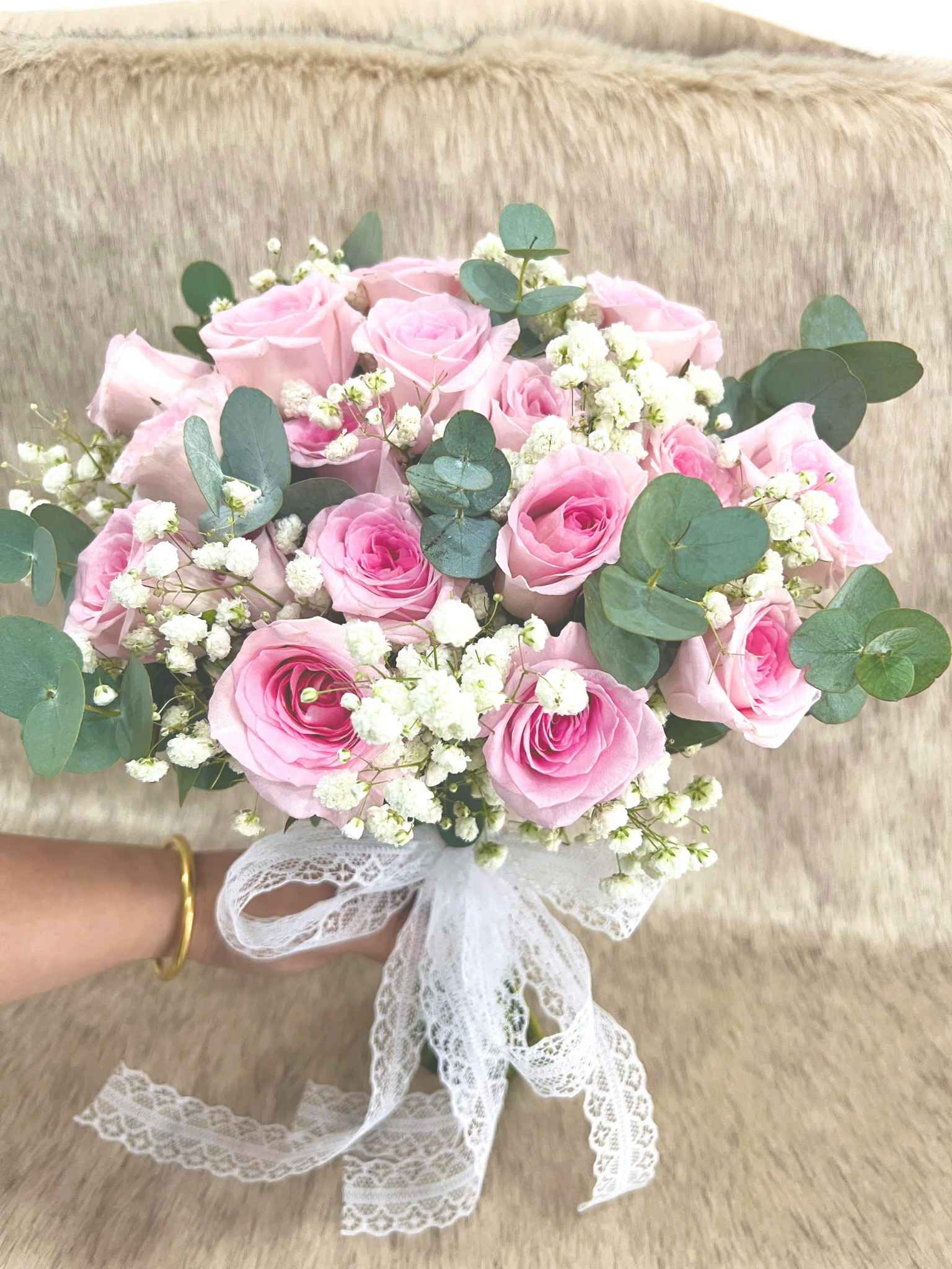 Một trong những kiểu bó được ưa chuộng nhất. Baby trắng tạo sự bồng bềnh, kết hợp cùng hồng trắng làm nổi bật sự tinh tế và nhẹ nhàng.