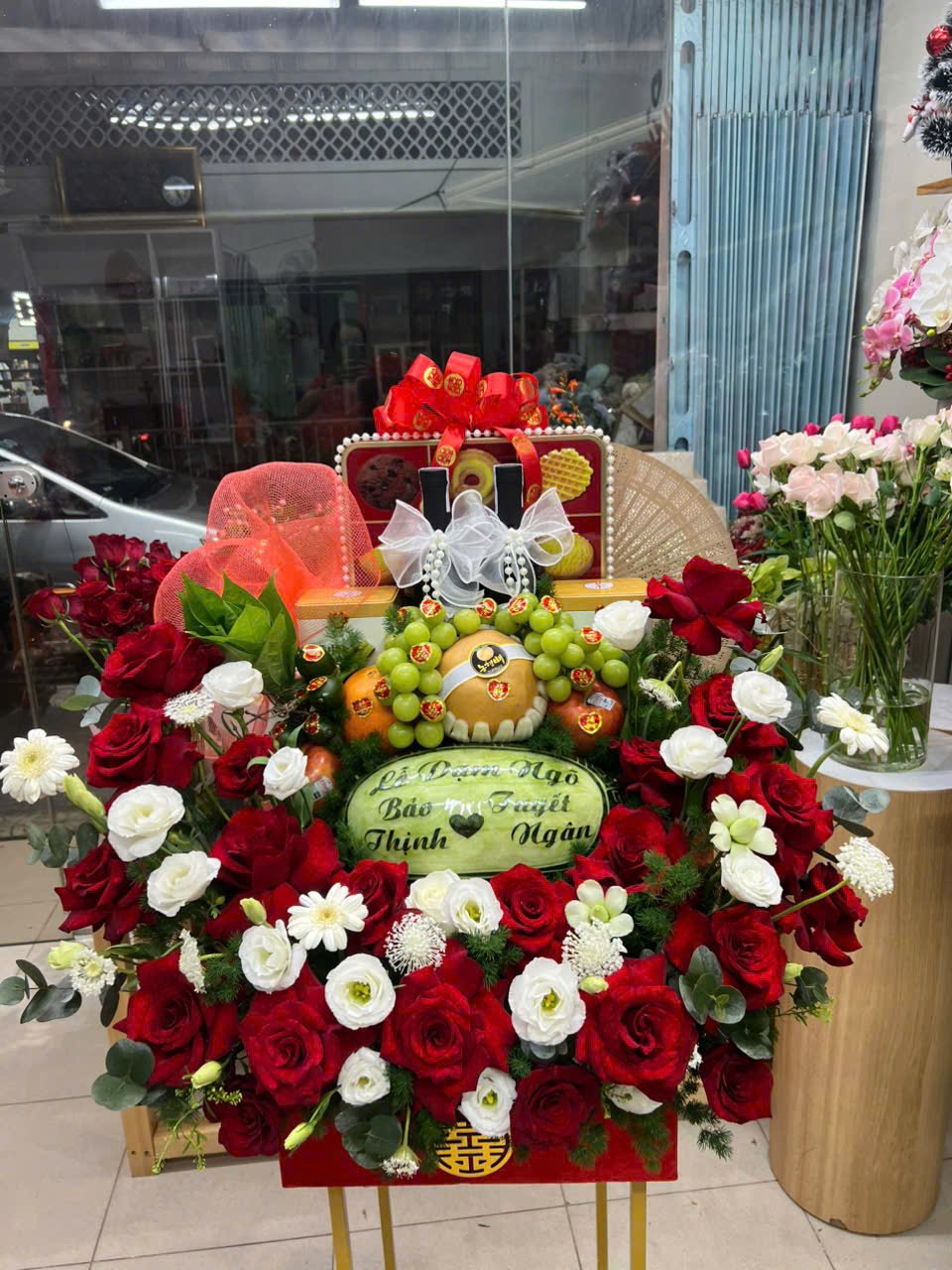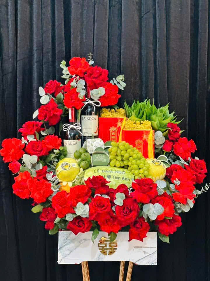 → Trầu cau, bánh kẹo, trái cây, trà rượu, dưa hấu khắc chữ, hoa tươi.