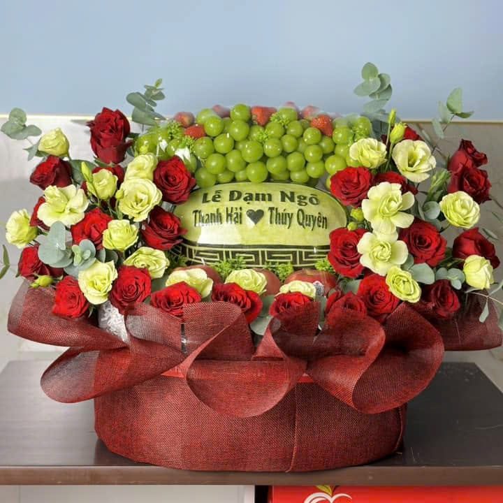 Giỏ trái cây dạm ngõ tại TH Flowers mang phong cách hiện đại nhưng vẫn giữ nét văn hóa truyền thống, giúp buổi lễ thêm phần trang trọng, ý nghĩa và hoàn hảo trong mắt hai bên gia đình.