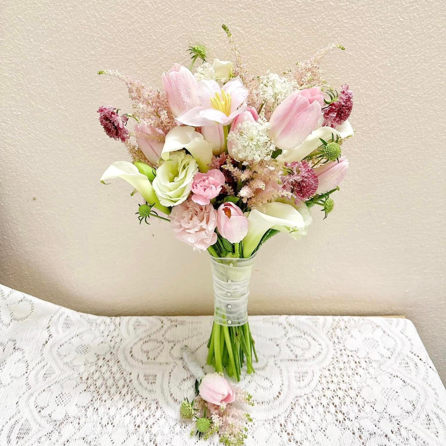 Mẫu 5: Hoa cưới cầm tay calla lily phối tulips hồng nhạt