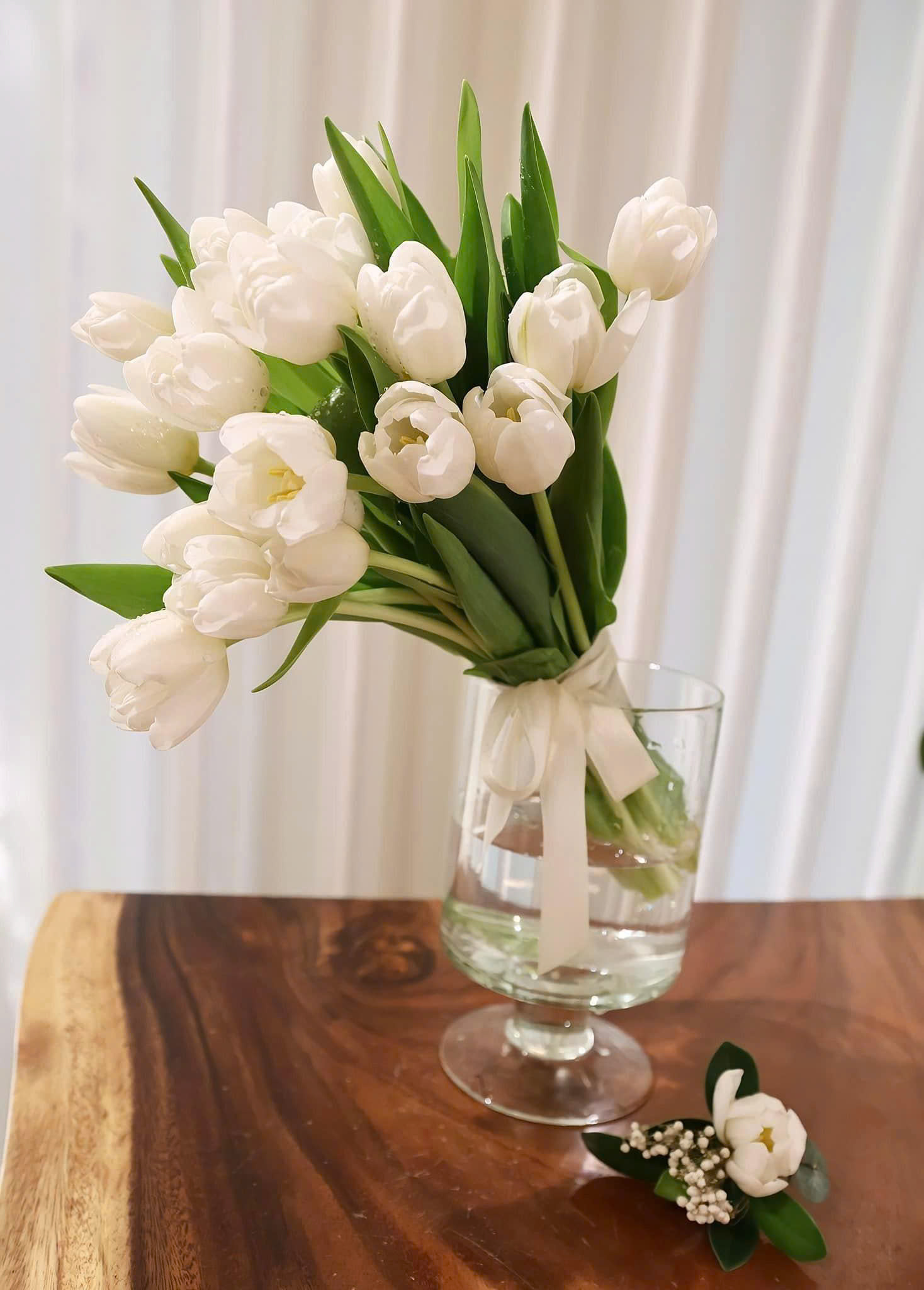 Phù hợp: tulip trắng trang nhã hoặc tulip phối lan hồ điệp trắng.