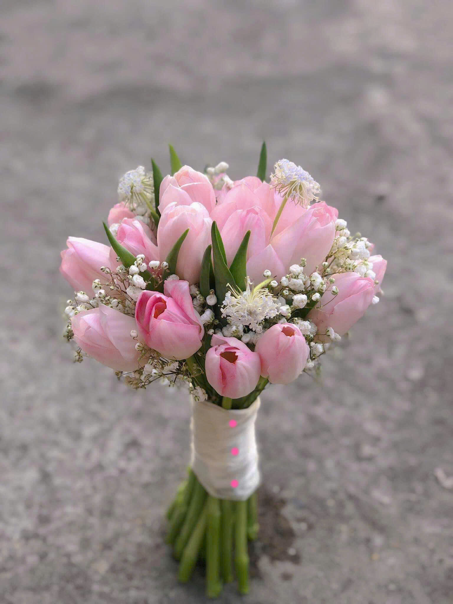 Phù hợp: tulip hồng pastel bó tròn hoặc tulip trắng phối phi yến/baby.