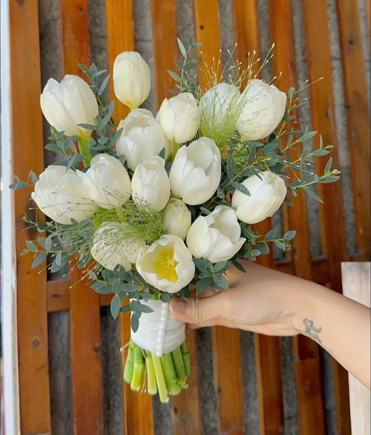 Phù hợp: tulip trắng kết hợp phi yến, lá bạc, hoặc thiết kế bó dài tự do.