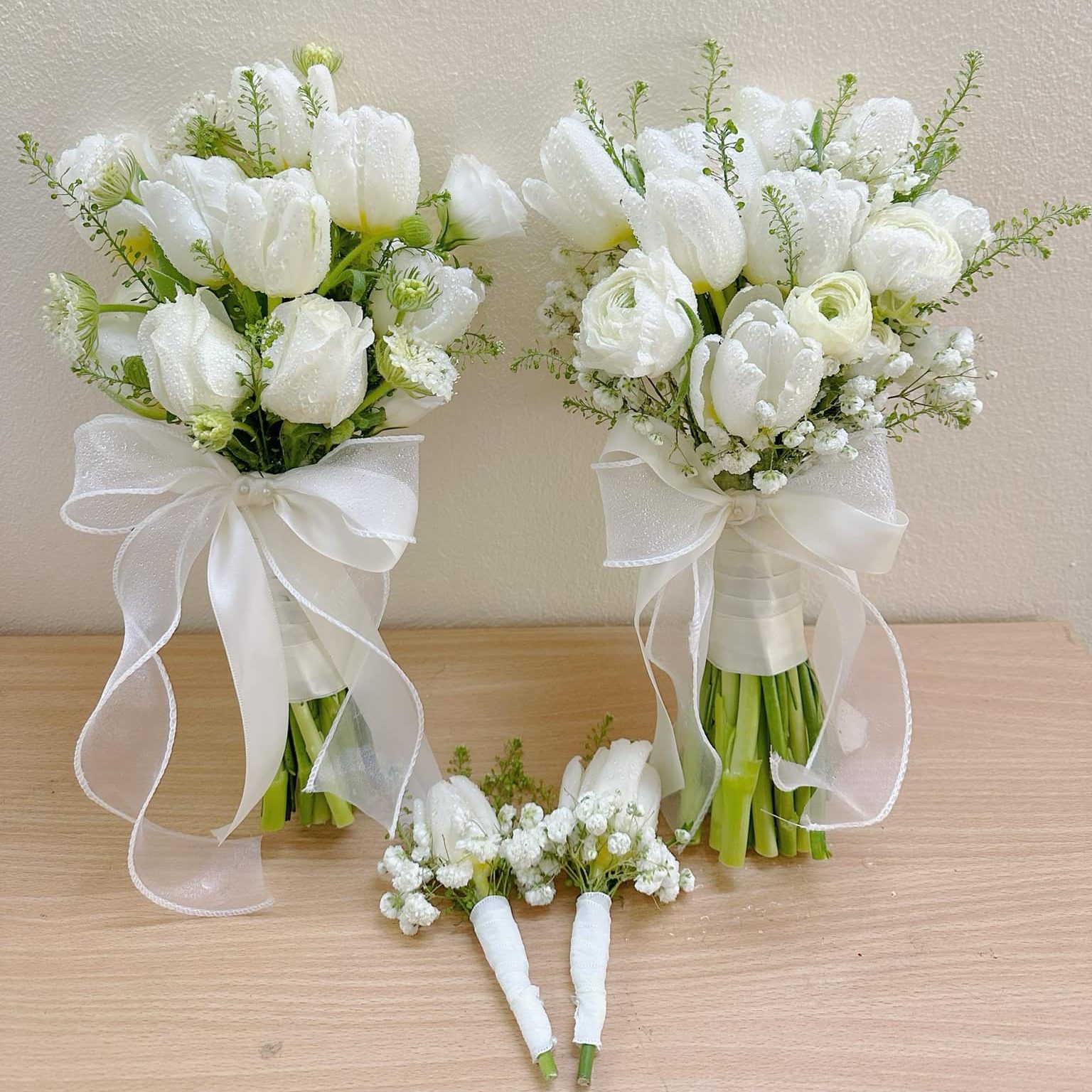 Khi hòa quyện, bó hoa trở thành biểu tượng của sự thanh lịch và thuần khiết, gửi gắm lời chúc phúc ý nghĩa cho đôi uyên ương.
