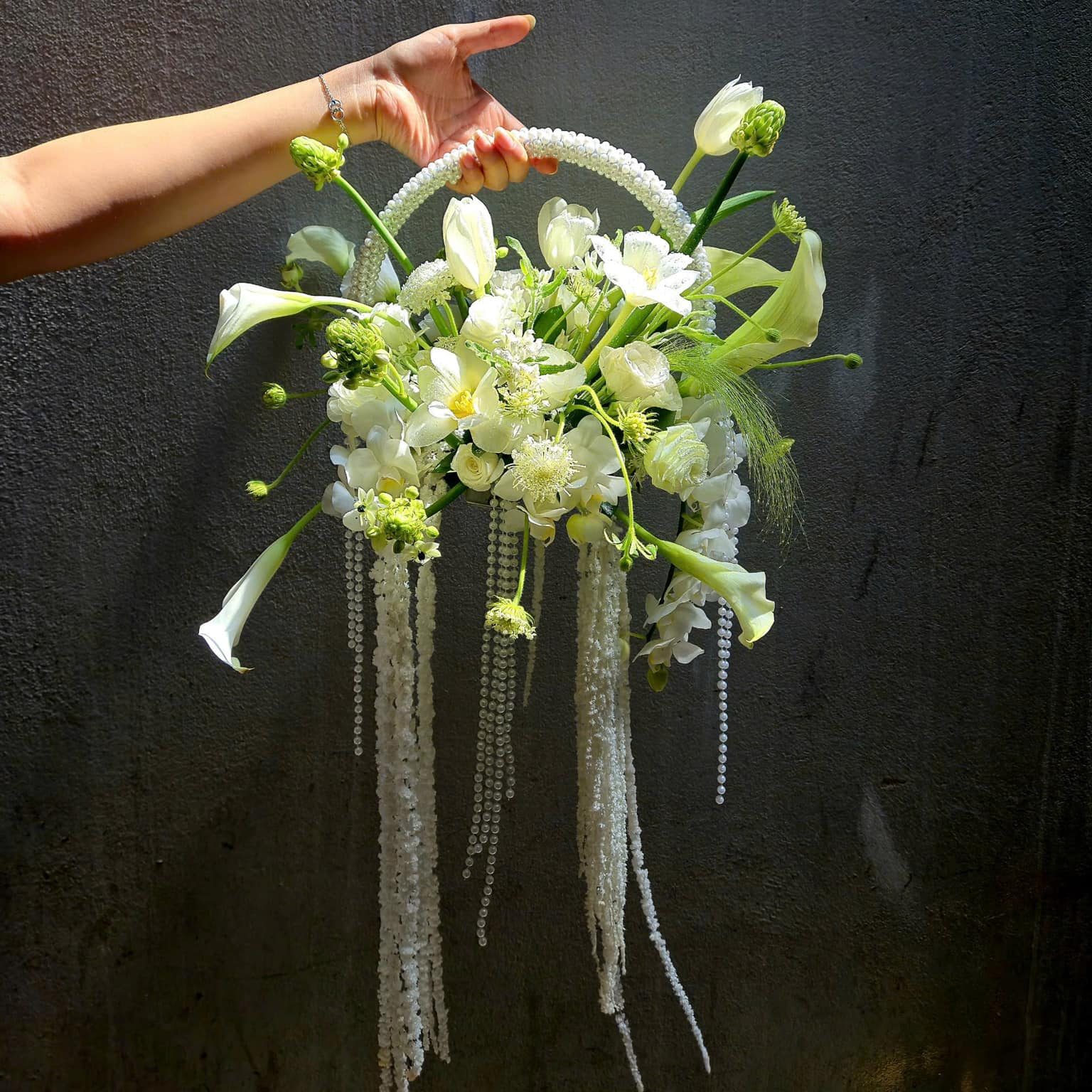Mẫu hoa cưới cô dâu kiểu Hàn Quốc mang vẻ đẹp tối giản nhưng vô cùng tinh tế, đặc trưng bởi sự cân đối, nhẹ nhàng và sang trọng. Tông trắng chủ đạo giúp mang lại cảm giác thuần khiết, thanh cao và rất ăn hình trong mọi concept chụp ảnh cưới. Bó hoa dáng tự nhiên, mềm mại, phù hợp hoàn hảo với phong cách bridal Hàn Quốc: nhẹ nhàng – trong trẻo – thanh lịch.