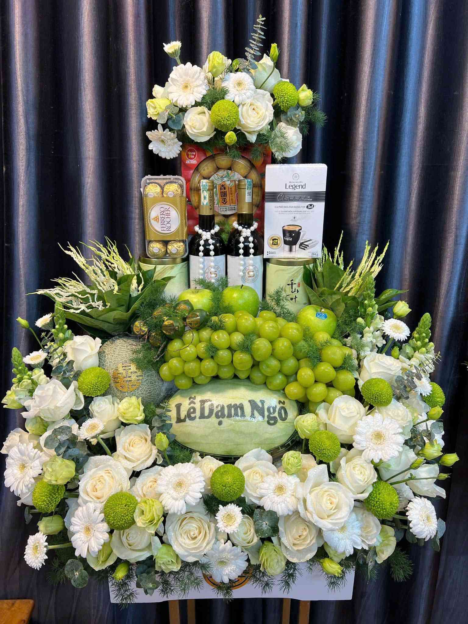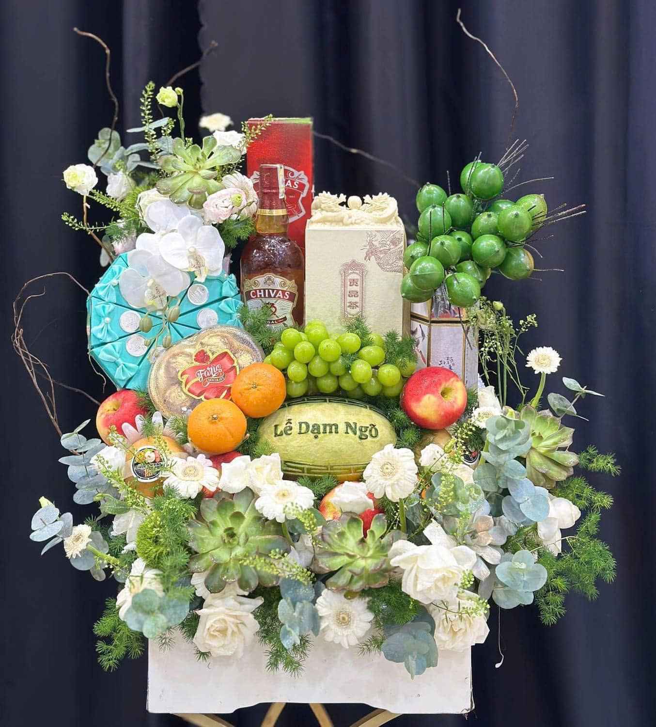 Lễ vật gồm toàn bộ trái cây ngoại cao cấp, bánh kẹo nhập khẩu như macaron, socola, rượu vang. Hoa decor là lan hồ điệp, hồng nhập khẩu, phối cùng ánh kim nhẹ. Bộ tráp này thường dao động từ 2.5–3 triệu, thích hợp cho gia đình muốn lễ sang trọng.